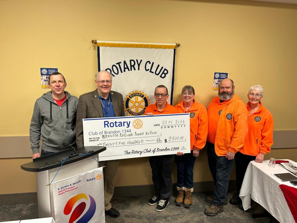 On 22 January 2024, The Rotary Club of Brandon has donated $2500.00 to Brandon Regional Search and Rescue for the purpose of purchasing new rescue ropes. This will allow us to continue to train in rope rescue skills and provide this capability for future searches. Once again, thank you to the Rotary Club of Brandon for their support in the Brandon community.