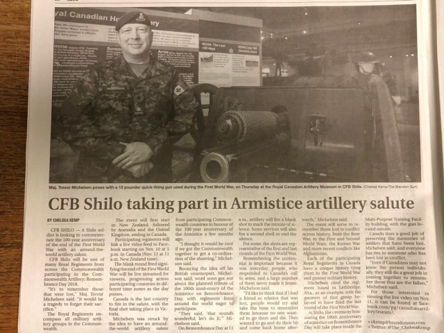 Source: Kemp, Chelsea. “CFB Shilo taking part in Armistice artillery salute.” Brandon Sun, 2 November 2018. Accessed online: https://www.brandonsun.com/local/cfb-shilo-taking-part-in-armistice-artillery-salute-499364911.html.